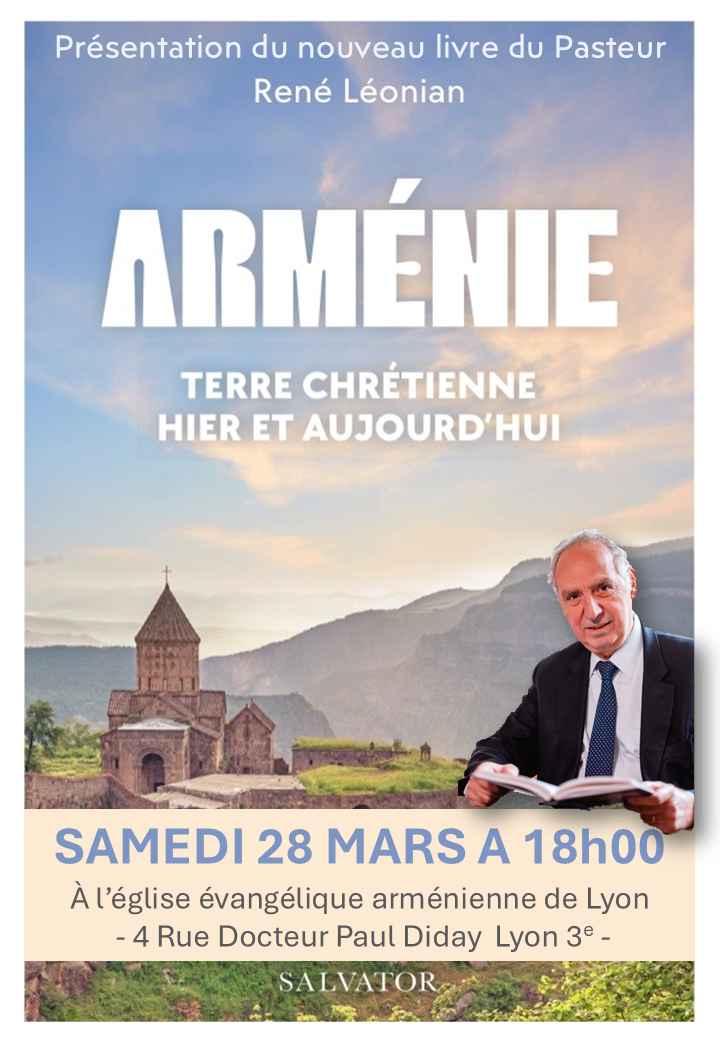 Le Pasteur René Léonian sera à l’Église Évangélique Arménienne de Lyon le samedi 28 mars à 18h pour la présentation de son livre : « Arménie : Terre chrétienne hier et aujourd’hui«